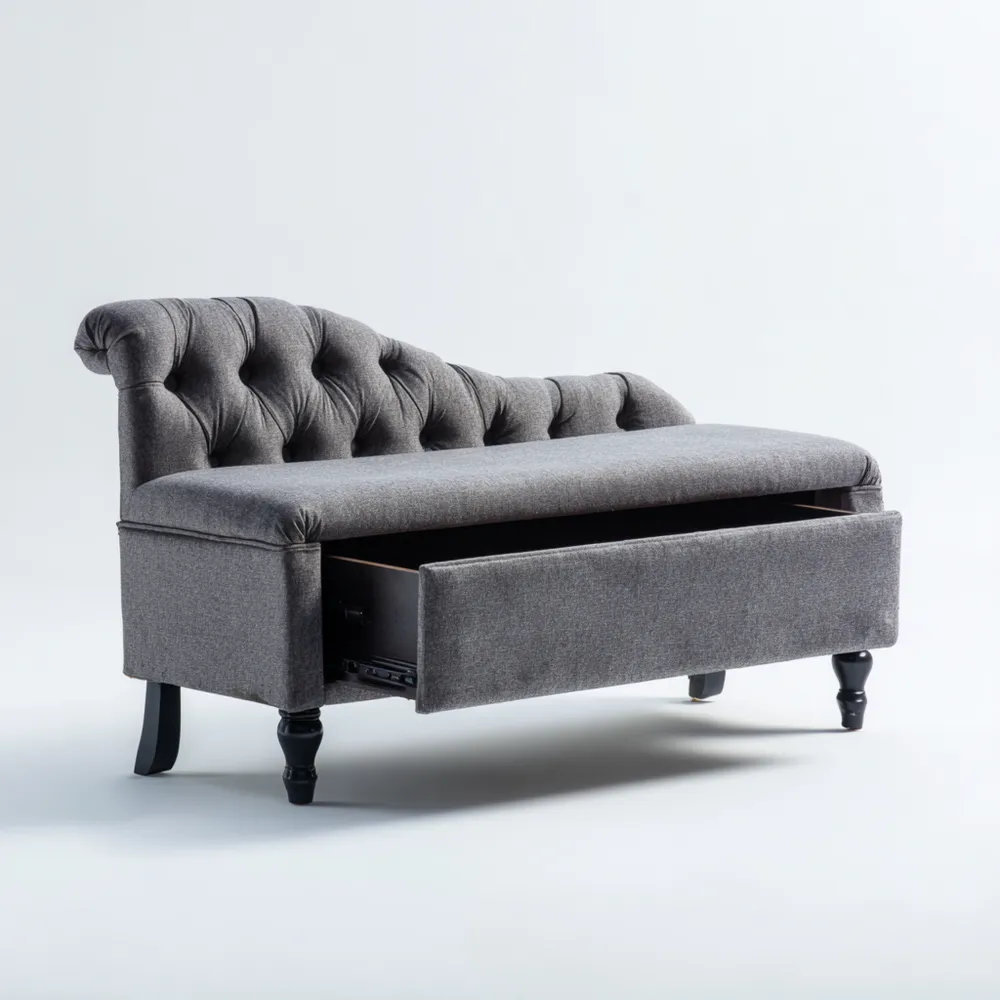Die Stoffbank bietet praktischen Stauraum und ist mit strapazierfähigem Polyester in Dunkelgrau bezogen. Die Beine bestehen aus Holz.